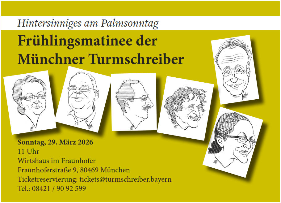 Vor dem Osterhasen kommen die Literatinnen und Literaten! Ende März laden die Münchner Turmschreiber wieder zur Matinee in das Wirtshaus im Fraunhofer. Am Palmsonntag, den 29. März, um 11 Uhr werden Texte und Gedankenspiele über Frühlingsgefühle und Osterüberraschungen serviert. Mit dabei sind unter anderem Wolfgang Ludwig Müller, Anton G. Leitner, Gabriele Trinckler sowie die „Matinee-Stammbesetzung“ Wolfgang Oppler, Georg Eggers und Melanie Arzenheimer. Zudem ist das Auftauchen literarischer Überraschungsgäste oder etwaiger Palmesel nicht auszuschließen. Und selbstverfreilich wird um 12 Uhr eine gepflegte Weißwurst-Pause eingelegt.